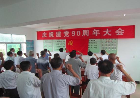 2011年6月30日上午,宜秀區五橫鄉楊亭村全村黨員歡聚一堂喜慶中國共產黨成立90周年。參會黨員面對黨旗,重溫入黨誓詞。回首我黨90年崢嶸歲月,90年光輝歲月,90年豐功業績。圖為楊亭村慶祝建黨90周年大會現場。