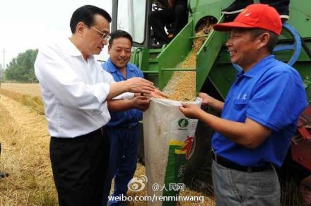7日,中國國務院總理李克強在河北邯鄲考察三夏麥收情況。考察途中,李克強登上一部收割機的駕駛艙,躬身和駕駛員聊天。收割機駕駛員老周告訴李克強,這臺收割機是從河南南陽起程,從南到北一路收過來的。他們沿路看到今年的小麥收成比去年好一兩成。