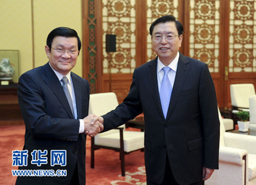 全國人大常委會委員長張德江20日下午在人民大會堂會見了越南國家主席張晉創(chuàng)。