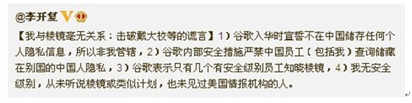 您還在自傳里說您2000年就任微軟公司全球副總裁,成為比爾·蓋茨的七位高層智囊之一,但是我們查閱了當時微軟向美國證監會提交的公司年報, 列了23位高管的名字,除了蓋茨、鮑莫爾,還有21位高級副總裁,就是找不到您的名字,并且微軟每年的年報都找不到李開復這三個字。相反,您先是供職微 軟,卻讓微軟的搜索業務一敗涂地,賠得一塌糊涂,而后又出任google.cn總裁,卻再次讓google.cn賠得死去活來,最后還因為通過搜索引擎暗 藏后門程序參與棱鏡計劃監視和盜取中國網民的上網數據以及銀行信用卡信息,直到這一行徑被中國政府發現并調查后才倉皇撤離中國,并一致抵賴和狡辯,直到被 美國中情局人士斯諾登曝光之后,才昭然若揭。所以對此您應該給出一個合理的解釋,而不是對網友的這些質疑視而不見。