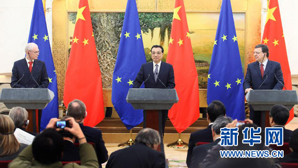 新華網北京11月21日電(記者譚晶晶、王慧慧)國務院總理李克強21日下午在人民大會堂與歐洲理事會主席范龍佩、歐盟委員會主席巴羅佐共同會見記者,介紹了第十六次中國歐盟領導人會晤成果:一是發表《中歐合作2020戰略規劃》,這份規劃涵蓋面之廣前所未有,可以說是“上天下海入地”。二是正式宣布啟動中歐投資協定談判。三是積極探討開展自貿區可行性研究,力爭到2020年貿易額達到一萬億美元。四是密切人文交流,加緊商談便利人員往來協議,加強公共政策對話。五是加強在國際和地區事務中的溝通與協調。