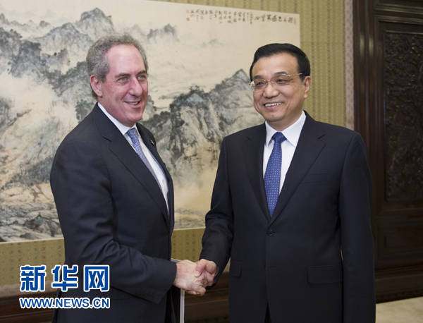 這是李克強(qiáng)與美國(guó)貿(mào)易代表弗羅曼握手。新華社記者 謝環(huán)馳 攝
