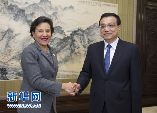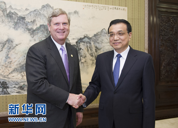這是李克強(qiáng)與美國(guó)農(nóng)業(yè)部長(zhǎng)維爾薩克握手。新華社記者 謝環(huán)馳 攝