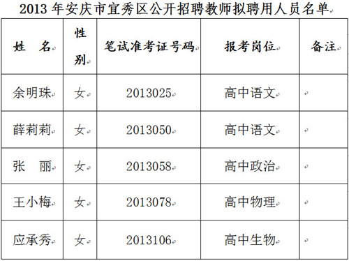 2013年安慶市宜秀區公開招聘教師擬聘用人員名單公示