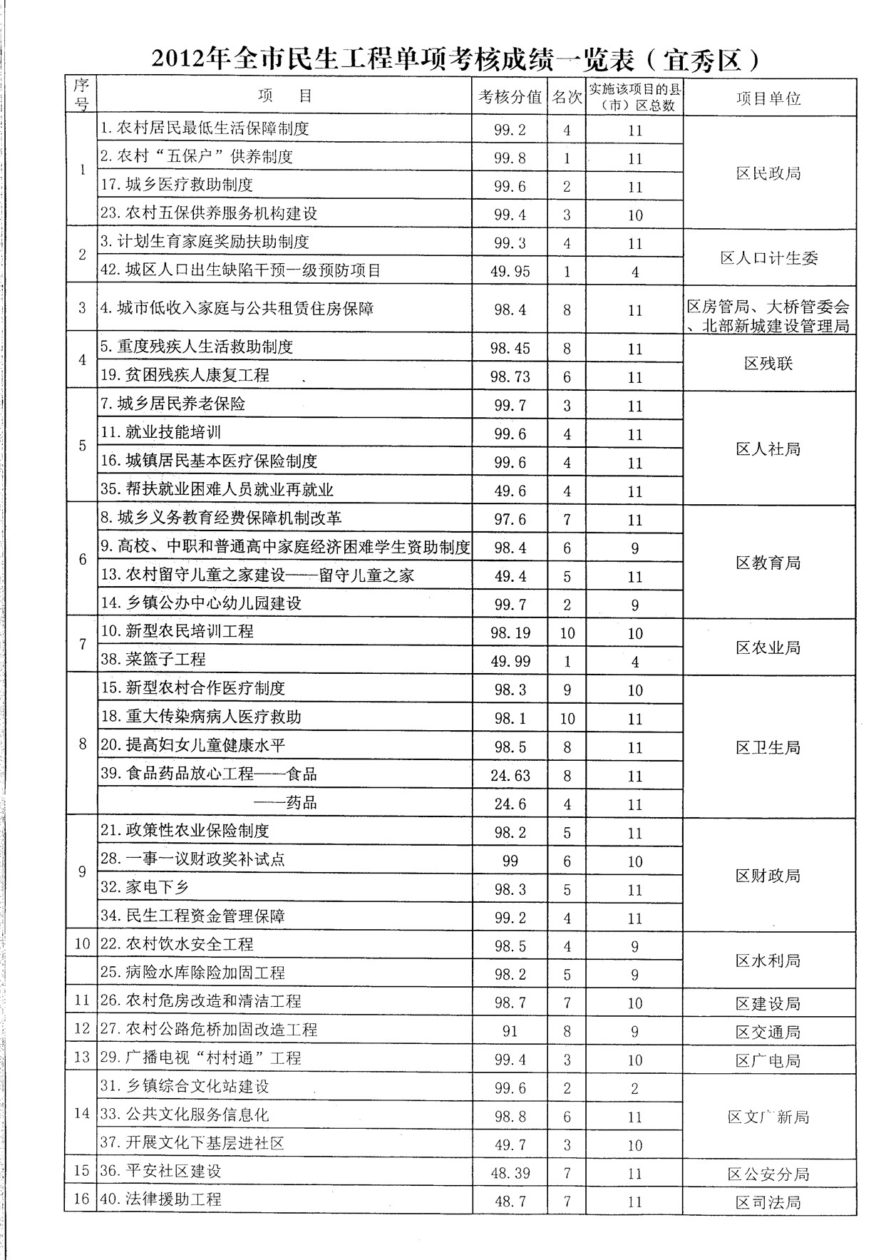 2012年全市民生工程單項考核成績一覽表(宜秀區)