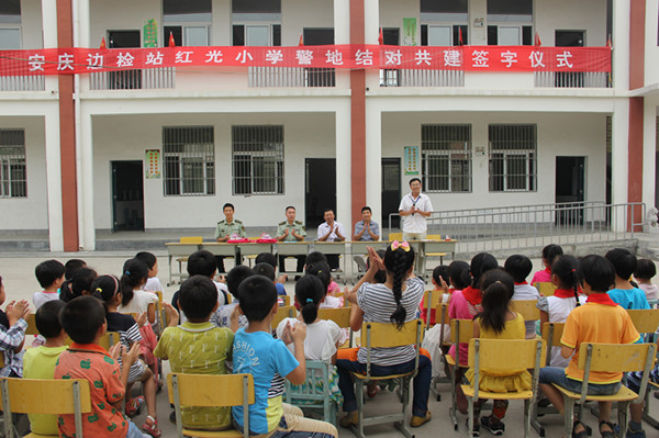 9月10日,安慶市邊檢站紅光社區及大橋中心學校相關負責同志來我校警地結對共建簽字儀式,并資助兩名貧困學生,各位領導和全體師生一起參加警地結對共建簽字儀式。