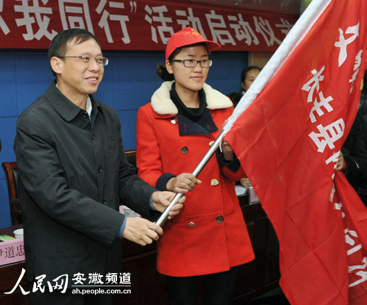 在合肥市長豐縣“文明上網、你我同行”活動啟動儀式上,安徽省互聯網宣傳管理辦公室主任章理中為該縣文明上網志愿者授旗。