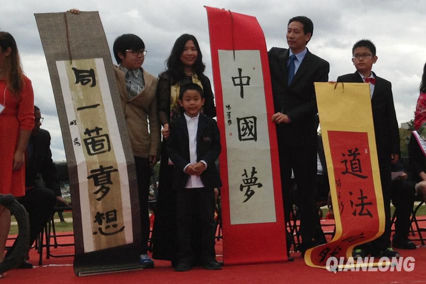 資料圖片:2013年國慶節(jié),張圣博參加華盛頓第十五屆中國文化節(jié),展示書寫的“中國夢”作品(千龍網(wǎng)發(fā))。