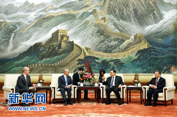 3月17日,全國人大常委會委員長張德江在北京人民大會堂會見由美國國會眾議院“美中工作小組”共同主席波斯坦尼(左二)和拉森率領的代表團。新華社記者 姚大偉 攝