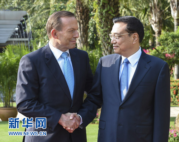 4月9日,國務院總理李克強在海南省三亞市同澳大利亞總理阿博特舉行中澳總理年度定期會晤。 新華社記者李學仁攝