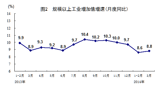 一季度,全國規模以上工業增加值按可比價格計算同比增長8.7%,增幅比上年同期回落0.8個百分點。分經濟類型看,國有及國有控股企業增加值同比增長4.5%,集體企業增長3.1%,股份制企業增長10.0%,外商及港澳臺商投資企業增長7.8%。分三大門類看,采礦業增加值同比增長3.3%,制造業增長9.9%,電力、熱力、燃氣及水生產和供應業增長4.5%。分地區看,東部地區增加值同比增長8.1%,中部地區增長8.9%,西部地區增長10.4%。分產品看,464種產品中有324種產品產量同比增長。一季度規模以上工業企業產銷率達到97.1%,同比下降0.1個百分點。規模以上工業企業實現出口交貨值25773億元,同比增長4.2%。3月份,規模以上工業增加值同比增長8.8%,環比增長0.81%。