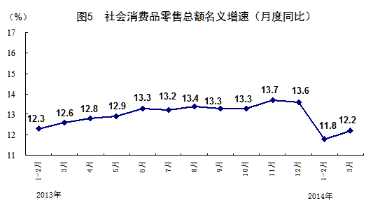 一季度,社會消費品零售總額62081億元,同比名義增長12.0%(扣除價格因素實際增長10.9%)。其中,限額以上單位消費品零售額30275億元,增長9.7%,限額以上單位網上零售額815億元,增長51.7%。按經營單位所在地分,城鎮消費品零售額53553億元,同比增長11.8%,鄉村消費品零售額8528億元,增長12.8%。按消費形態分,餐飲收入6465億元,同比增長9.8%,商品零售55616億元,增長12.2%,其中限額以上單位商品零售28409億元,增長10.3%。3月份,社會消費品零售總額同比名義增長12.2%(扣除價格因素實際增長10.8%),環比增長1.23%。