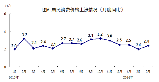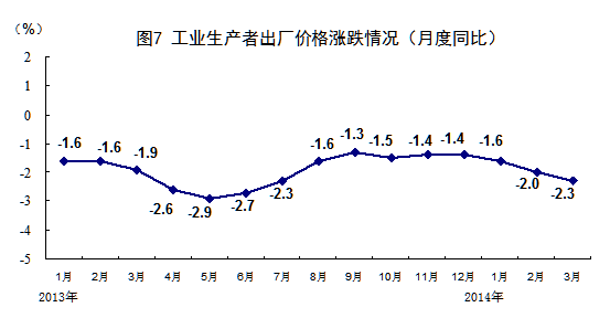 一季度,居民消費價格同比上漲2.3%。其中,城市上漲2.4%,農村上漲2.0%。分類別看,食品價格同比上漲3.5%,煙酒及用品下降0.7%,衣著上漲2.2%,家庭設備用品及維修服務上漲1.3%,醫療保健和個人用品上漲1.1%,交通和通信下降0.2%,娛樂教育文化用品及服務上漲2.5%,居住上漲2.7%。在食品價格中,糧食價格上漲2.9%,油脂價格下降5.1%,豬肉價格下降6.6%,鮮菜價格上漲5.8%。3月份,居民消費價格同比上漲2.4%,環比下降0.5%。一季度,工業生產者出廠價格同比下降2.0%,3月份同比下降2.3%,環比下降0.3%。工業生產者購進價格同比下降2.1%,3月份同比下降2.5%,環比下降0.5%。