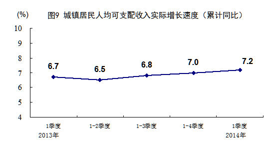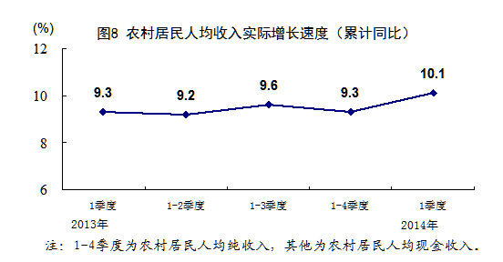 一季度,全國農村居民人均現金收入3224元,同比名義增長12.3%,扣除價格因素實際增長10.1%。全國城鎮居民人均可支配收入8155元,同比名義增長9.8%,扣除價格因素實際增長7.2%。根據從2012年四季度起實施的城鄉一體化住戶調查,2014年一季度全國居民人均可支配收入5562元,同比名義增長11.1%,扣除價格因素實際增長8.6%。全國居民人均可支配收入中位數4694元,同比名義增長14.0%。一季度末,農村外出務工勞動力16933萬人,同比增加288萬人,增長1.7%。外出務工勞動力月均收入2681元,增長10.1%。