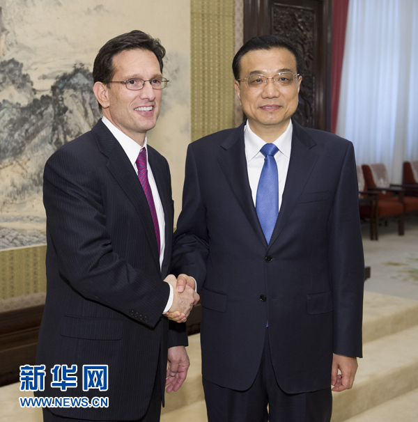4月24日,國務院總理李克強在北京中南海紫光閣會見由美國國會眾議院多數黨領袖坎托率領的議員代表團。 新華社記者 黃敬文 攝
