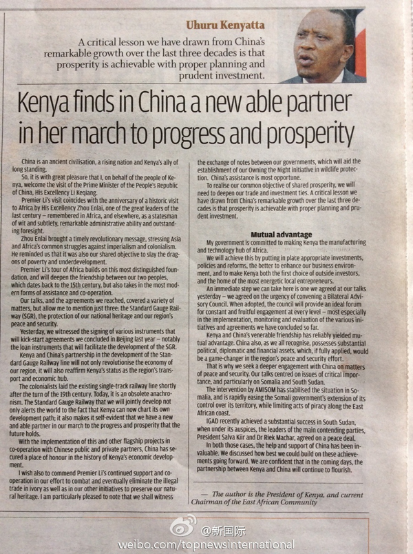 新華網北京5月11日電  據新華社“新國際”微博報道,肯尼亞《旗幟報》11日發表肯雅塔總統署名文章《肯將中國視為發展繁榮進程中的強力伙伴》。文章稱,李克強此訪將進一步加深傳統友誼,推動雙方新時期合作。隨著多領域的良好合作,中國在肯經濟社會發展中重要性與日俱增。肯方對肯中關系未來充滿信心。
