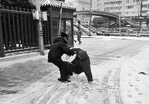 昨天早上,在地壇公園西門,一中年行人滑倒,正在掃雪的保安員過來將中年人扶起。