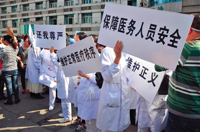 2013年10月28日,溫嶺市第一人民醫院內,數百名醫務人員舉著醫療暴力“零容忍”、維護正常醫療秩序等牌子,期望關注醫護人員人身安全。