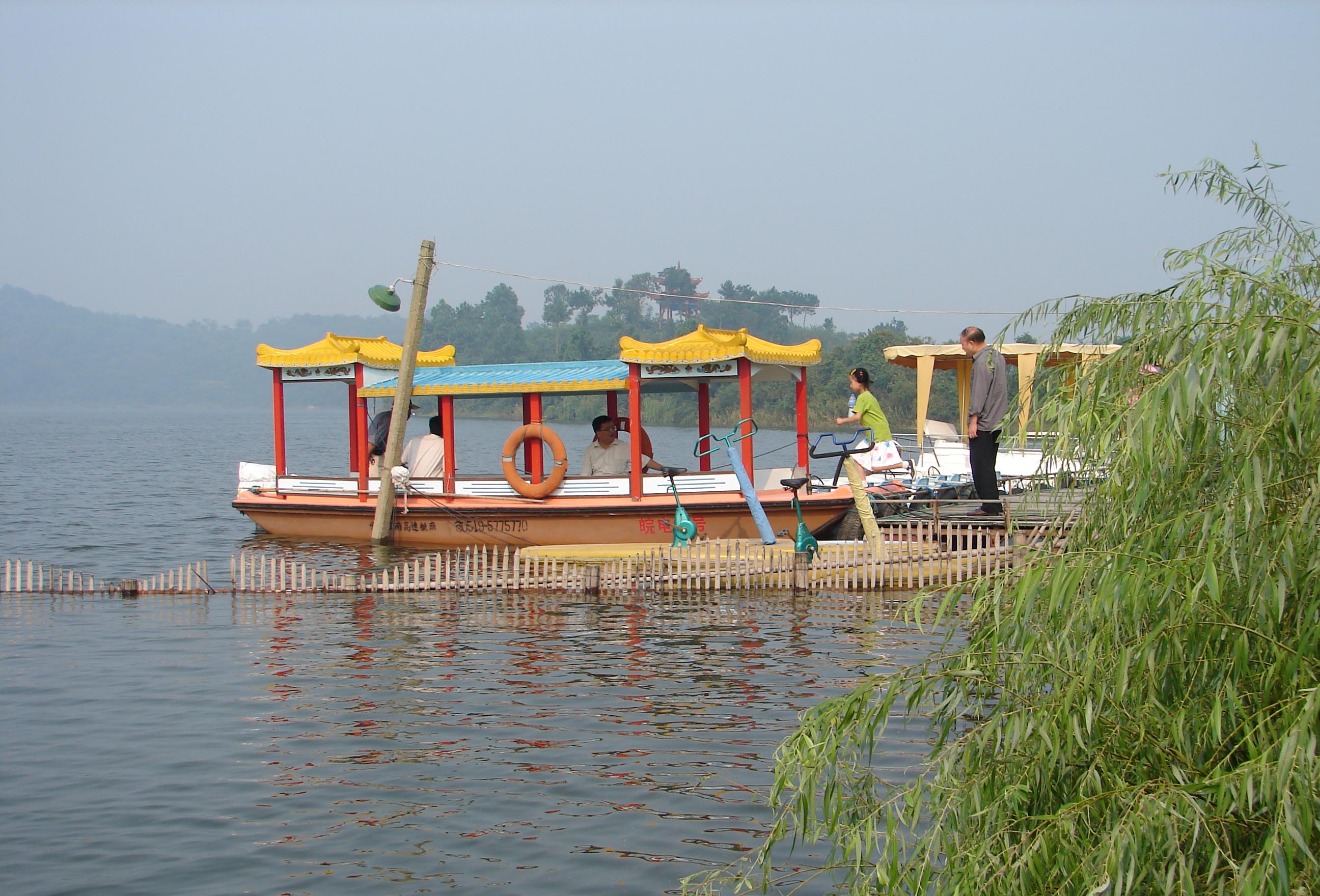 我站在山腰眺望,整個鮑沖湖一覽無余。它如雅潔的處子靜靜地躺在青山綠野之中,湖面一平如鏡,山影云天倒影于湖中更顯亮麗,遠處的小舟飄飄蕩蕩劃曳過來,把水中倒影攪得支離破碎,似乎是印象派畫家有意無意潑撒的各色油彩,既是畫,又是詩,更象夢中的詩畫。湖周平灘曲岸,綠樹蔥郁,游人如織。更遠處,與湖相連的田野綠苗茵茵,象碧綠的地毯一塊一塊平鋪開去,無邊無際。湖中最大的島嶼臥牛島呈現(xiàn)出一副巨人的姿態(tài),迎接著四面八方的來賓。臥牛島上別墅荷花樓在綠樹叢中若隱若現(xiàn),吸引著我劃一葉小舟上了臥牛島,直赴荷花樓。我站在荷花樓上環(huán)顧四周,更有一番景致,群山競秀,峰奇巖險,叢竹密樹,高低錯落。山借湖色愈顯滴翠,湖借山映更是清悠。眼前無限風光宛如一幅巨大的山水畫卷展現(xiàn)在我眼前。這時,童年的故事,童年的夢想,童年的模糊記憶都一下子清晰起來;無數(shù)次鮑沖湖的夢在這時似乎真實起來了,看著眼前秀麗山川,又好象進入美麗的夢境。