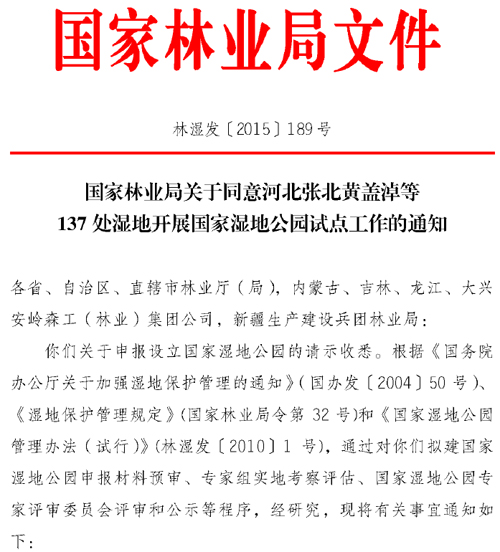 2015國家林業局關于同意河北張北黃蓋淖等137處濕地開展國家濕地公園試點工作的通知