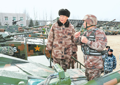 1月3日,中共中央總書記、國家主席、中央軍委主席習(xí)近平視察中部戰(zhàn)區(qū)陸軍某師。這是習(xí)近平登上99A坦克,詳細(xì)了解裝備戰(zhàn)技性能。 |