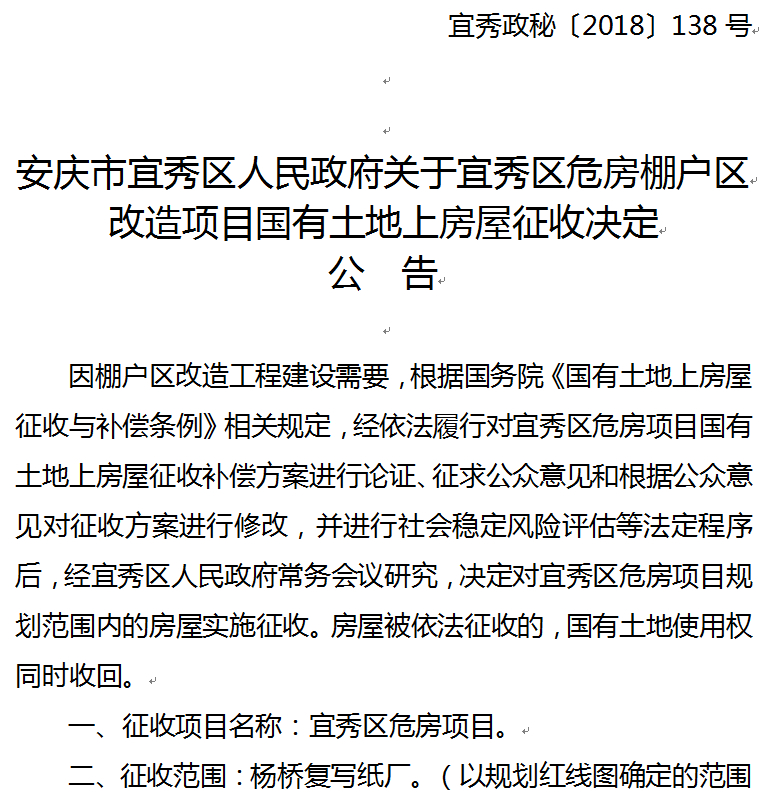 宜秀區(qū)印發(fā)危房征收補償方案的通知