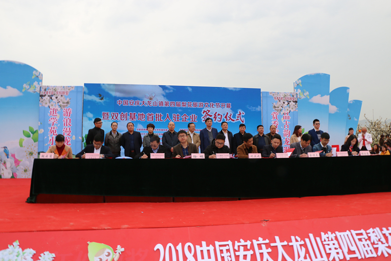 上午九點三十分,伴隨著動力十足的開場秀《旗鼓舞》的旋律,第四屆梨花旅游文化節(jié)的序幕正式拉開了。大龍山鎮(zhèn)人民政府鎮(zhèn)長余永創(chuàng),首先上臺致辭,并授牌全球旅游文化小姐擔任梨花節(jié)的宣傳大使。接著,宜秀區(qū)副區(qū)長周華斌和大龍山鎮(zhèn)黨政主要負責同志與落戶該鎮(zhèn)永林雙創(chuàng)基地涵蓋電子商務、軟件開發(fā)、廣告?zhèn)髅降刃袠I(yè)的11家企業(yè)正式簽約并合影留念。隨后,演出活動正式開始。