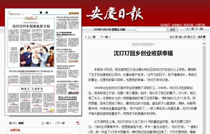 4月2日,家住宜秀區(qū)大龍山鎮(zhèn)永林社區(qū)的沈玎玎在送女兒上學(xué)后,便回到了位于雙創(chuàng)基地的公司內(nèi),忙著給客戶發(fā)貨。“過平凡的日子,孩子健康成長,有自己的事業(yè),這是我的奮斗目標(biāo),也是我的幸福。”沈玎玎告訴記者。