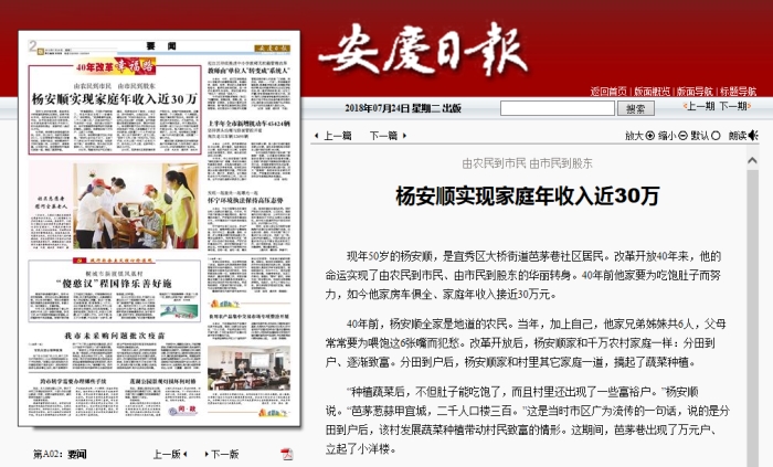 [安慶日報] 由農民到市民 由市民到股東 楊安順實現家庭年收入近30萬
