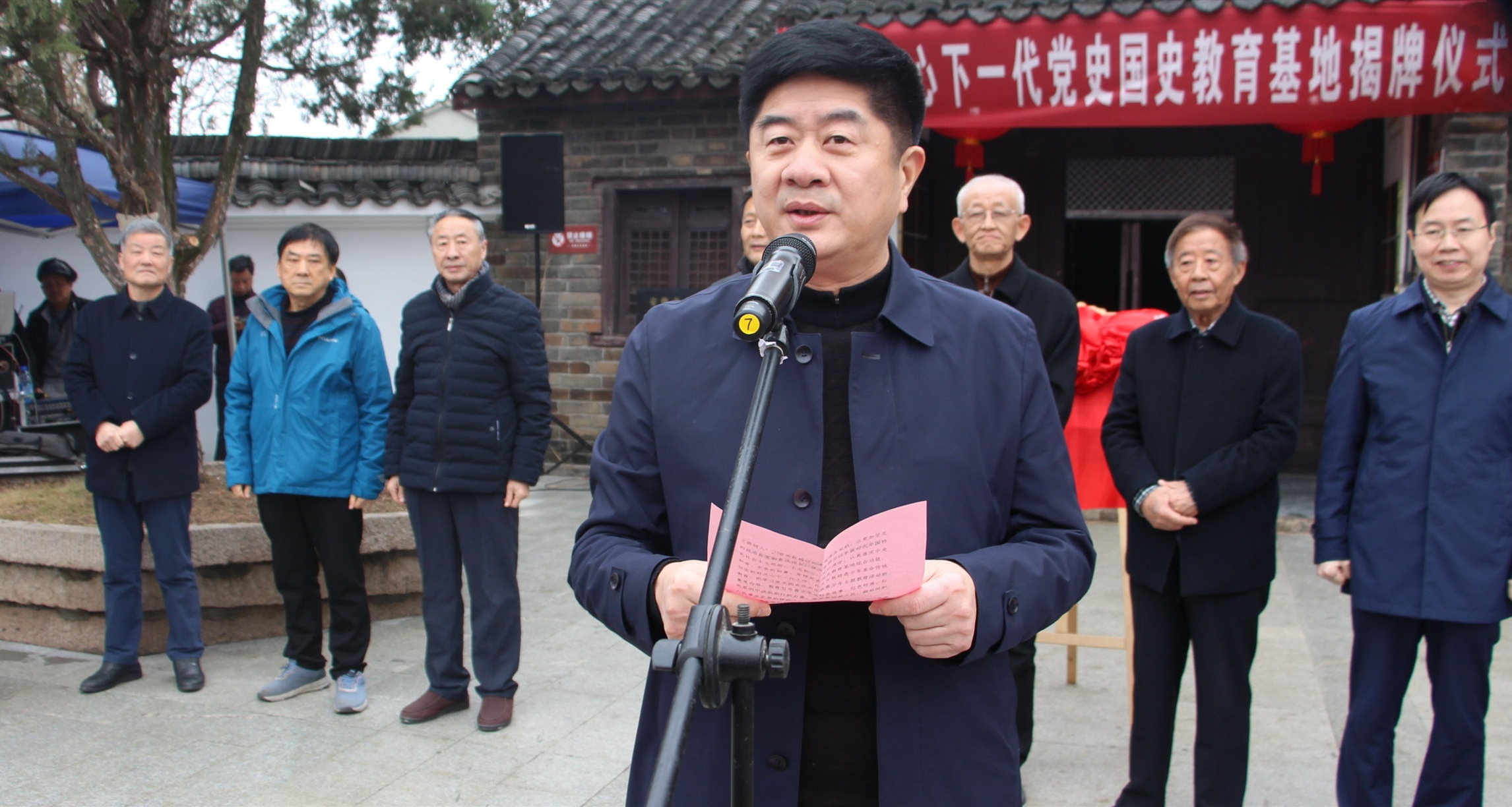 11月30日上午,全國關心下一代黨史國史教育基地揭牌儀式在兩鄧故居舉行。省關工委主任張俊,常務副主任陳履祥、郎濤,市委常委、組織部長胡紅兵,市關工委主任張世云,區委書記婁雪松,區委常委、組織部長林云飛等領導出席。迎江區、大觀區、經開區、宜秀區關工委、區直和五橫鄉有關部門負責同志以及安徽黃梅戲藝術職業學院、五橫初中、五橫中心學校學生代表等參加揭牌儀式。