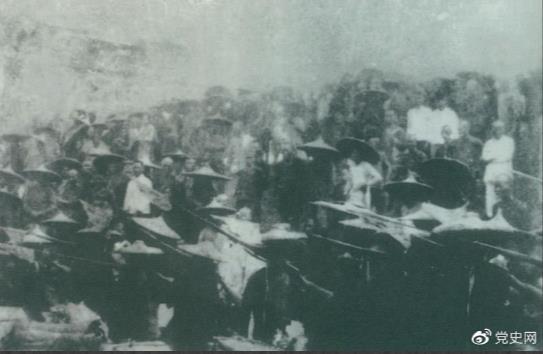 1926年7月9日,國民革命軍開始北伐。兩天后,北伐軍的先頭部隊葉挺獨立團攻占了長沙,然后向武漢進攻。一路上,迅猛發展的農民運動有力地配合了北伐戰爭。在湖南、江西、湖北,農民運動越來越引人注目。這是支援北伐戰爭的農民自衛軍。