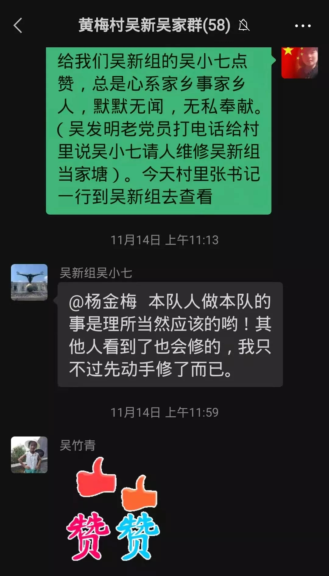 “當家塘需要修了,明天我和組長到村里去反映一下。”老黨員吳發明說道。“是的,現在洗衣服都不方便了,”村民代表吳金秀說:“明天我也和你一起去”。“修塘不能等要靠,作為一名黨員,應該為改善家鄉水利條件出一份力,修塘的費用全部由我來出……”說這話的人叫吳小七,常年在云南做餐飲生意,他常常惦記著家鄉的人和家鄉的事。在他的無私奉獻精神感召下,大家都自發的加入到了修塘的隊伍中來了,十來天的時間,這口當家塘就修好了,塘口周圍還安裝了安全護欄,栽種了綠植,成了吳新組一道亮麗的風景。