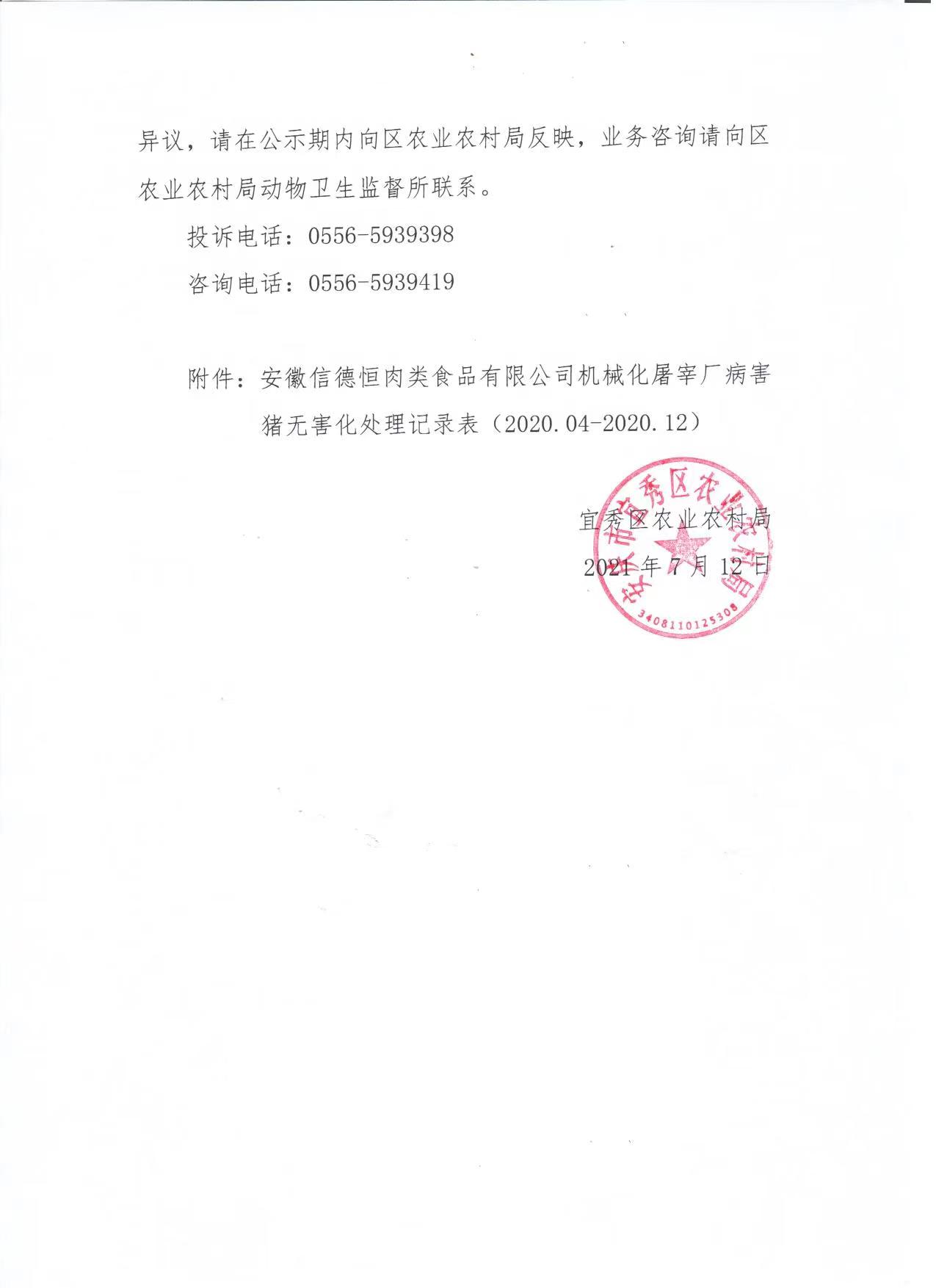 安徽信德恒肉類食品有限公司機械化屠宰廠病害豬無害化處理記錄表