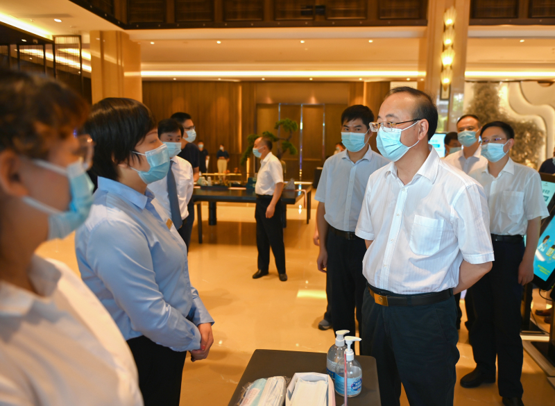 在世紀緣酒店,張祥安詳細詢問人員登記、體溫測量、日常消殺等情況,要求酒店落實主體責任,一刻不松做好防控工作。