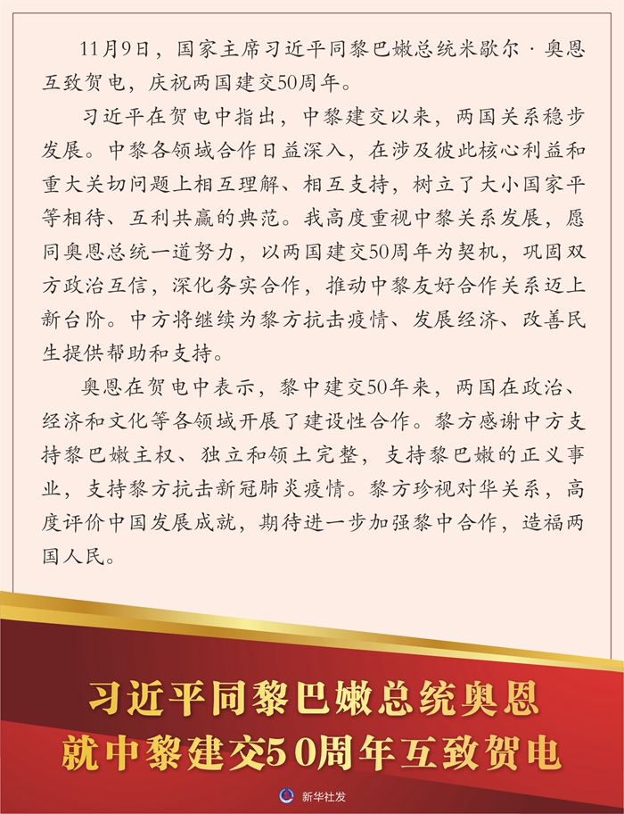 11月9日,國家主席習近平同黎巴嫩總統米歇爾·奧恩互致賀電,慶祝兩國建交50周年。
