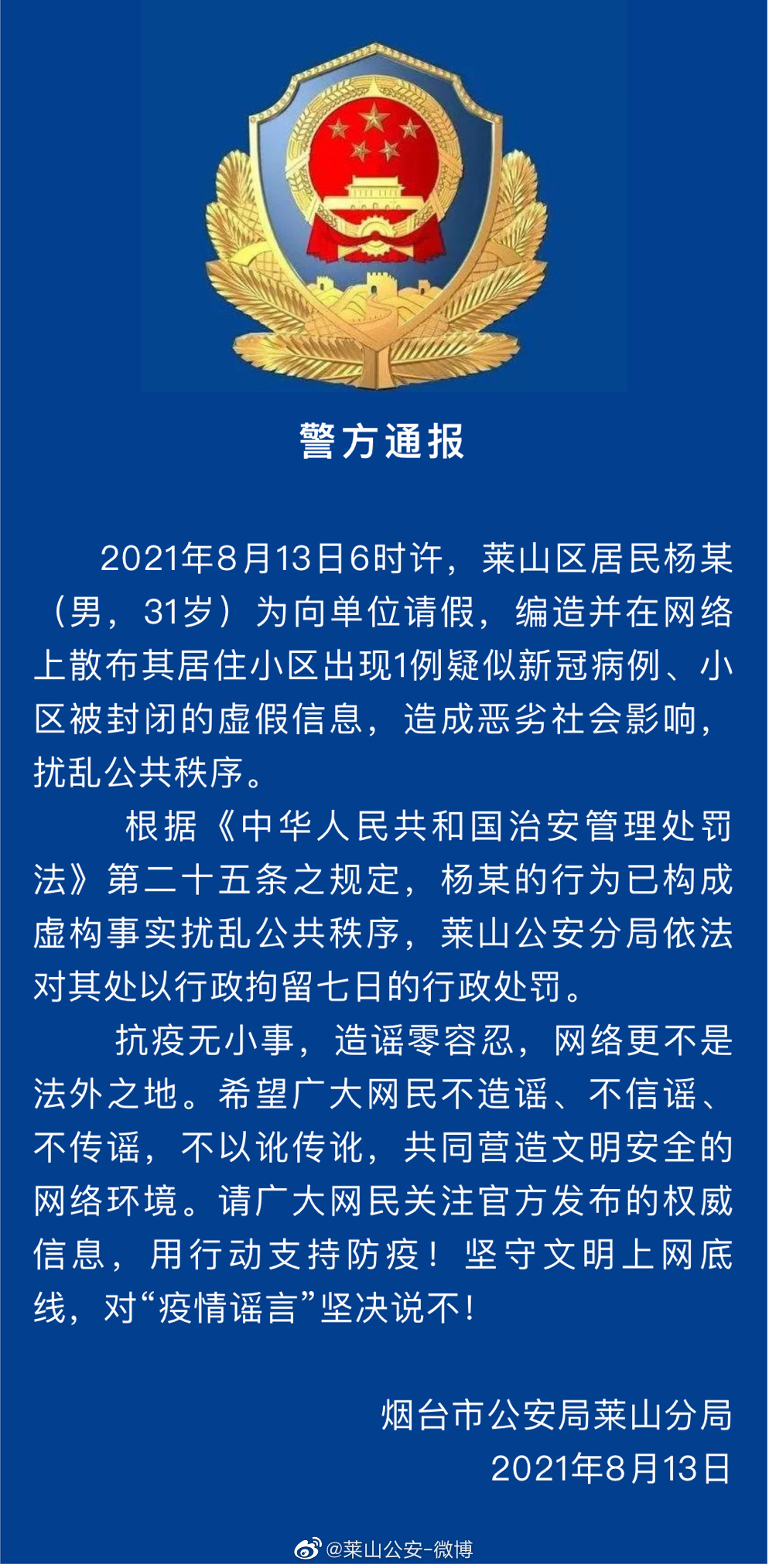 【辟謠】8月13日煙臺市公安局萊山分局通報,此消息為虛假信息。經查明,8月13日6時許,山東煙臺萊山區居民楊某(男,31歲)為向單位請假,編造并在網絡上散布其居住小區出現疑似新冠病例、小區被封閉的虛假信息,造成惡劣社會影響,擾亂公共秩序。目前楊某因虛構事實擾亂公共秩序被萊山公安分局依法行政拘留7日。