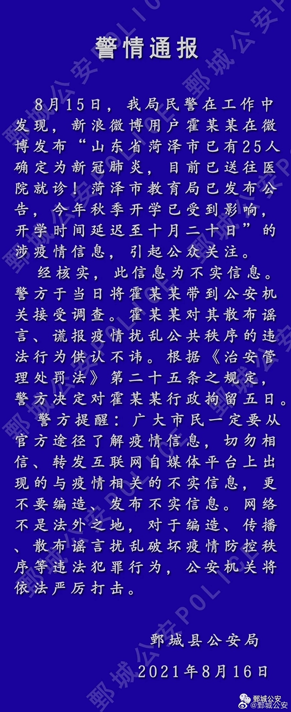 【辟謠】8月16日,山東省鄄城縣公安局發布警情通報稱“山東省菏澤市已有25人確定為新冠肺炎,目前已送往醫院就診!菏澤市教育局已發布公告,今年秋季開學已受到影響,開學時間延遲至十月二十日”為不實信息,警方于15日將信息發布者霍某某帶到公安局接受調查,霍某某對其散布謠言、謊報疫情擾亂公共秩序的違法行為供認不諱,警方依照《治安管理處罰法》第二十五條規定將對霍某某采取行政拘留五日的處罰措施。