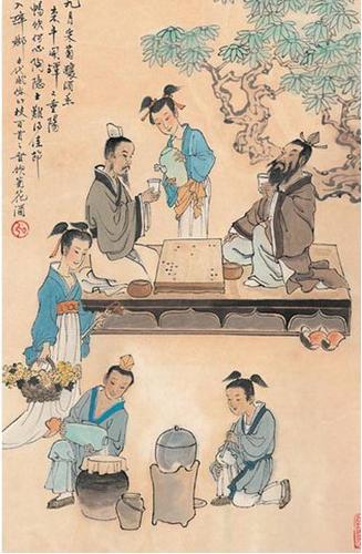 漢代,《西京雜記》中記西漢時的宮人賈佩蘭稱:“九月九日,佩茱萸,食蓬餌,飲菊花酒,云令人長壽。”相傳自此時起,有了重陽節(jié)求壽之俗。這是受古代巫師(后為道士)追求長生,采集藥物服用的影響。同時還有大型飲宴活動,是由先秦時慶豐收之宴飲發(fā)展而來的。《荊楚歲時記》云:“九月九日,四民并籍野飲宴。”隋杜公瞻注云:“九月九日宴會,未知起于何代,然自駐至宋未改。”求長壽及飲宴,構(gòu)成了重陽節(jié)的基礎(chǔ)。