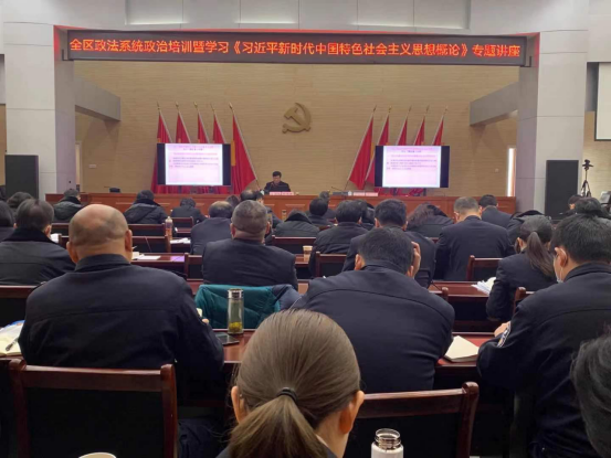法院全體在編在職政法干警在區政府會議室參加了專題講座,朱教授從習近平新時代中國特色社會主義思想研究了哪些重大問題、作出了哪些重大創新兩個方面,引經據典、深入淺出講解了習近平新時代中國特色社會主義思想體系,幫助政法系統干部準確理解習近平新時代中國特色社會主義思想,進一步樹牢“四個意識”,堅定“四個自信”,堅決做到“兩個維護”。