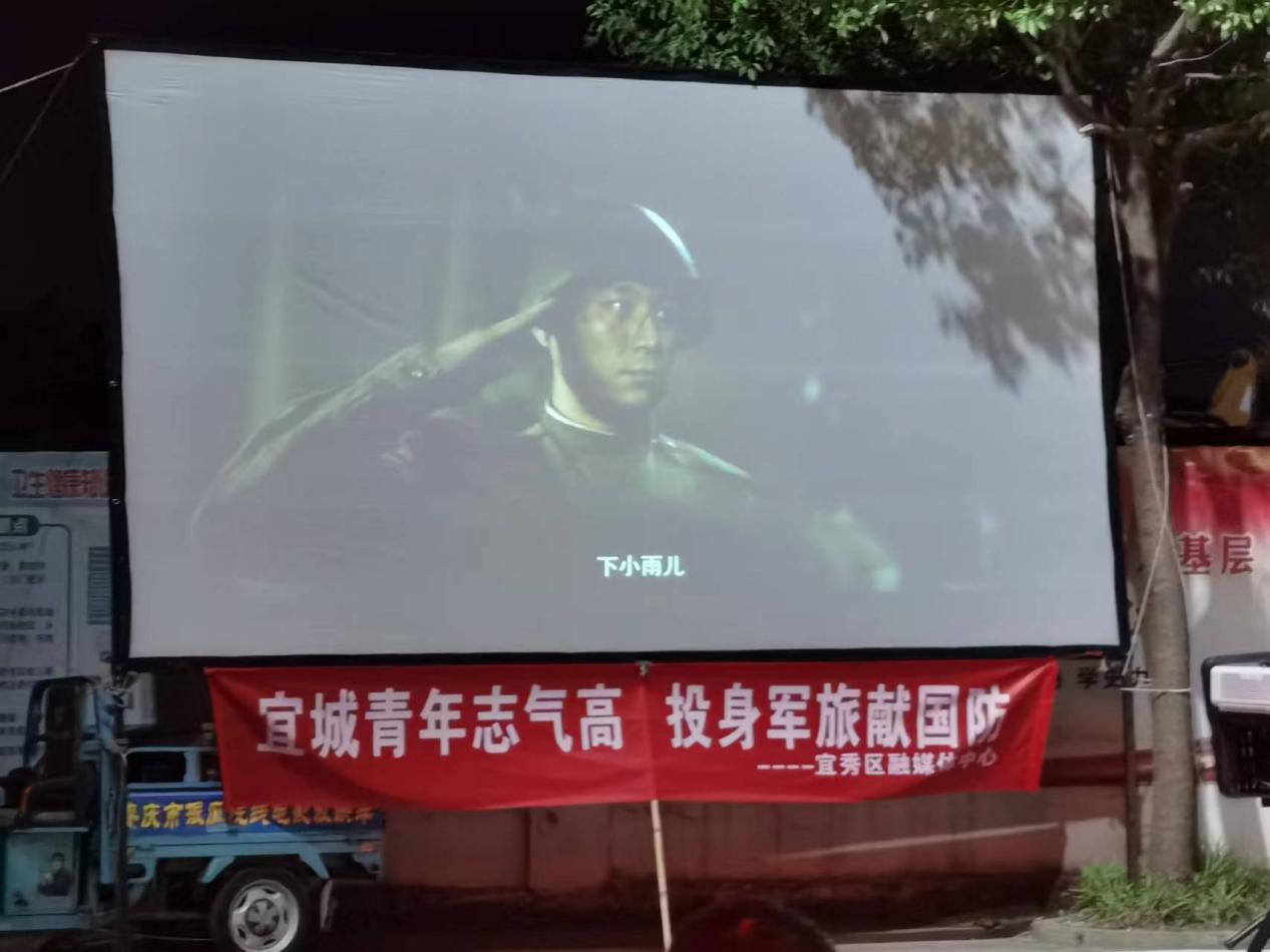 一塊幕布、一臺放映機,坐著板凳搖著蒲扇……8月8日晚,獨秀社區文化廣場上,居民們邀約一起,重溫了一把家門口看露天電影的“舊時光”。當晚,獨秀社區新時代文明實踐站組織開展以“宜城青年志氣高,投身軍旅獻國防”為主題的電影展映活動。