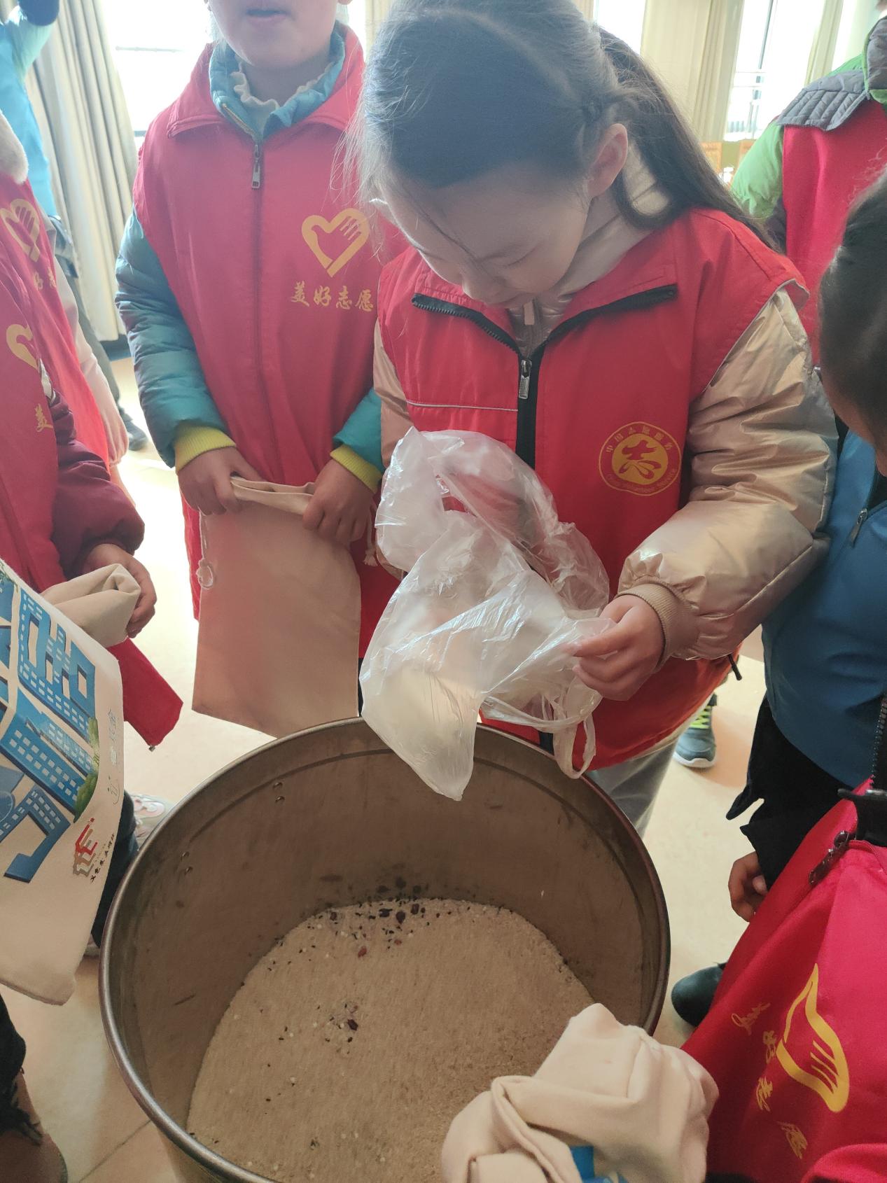 在活動(dòng)開始前,發(fā)生了一個(gè)非常有趣的小插曲,那位4歲的小小志愿者未雨綢繚,擔(dān)心自己募不到米,自帶了一勺米用來保底,惹得現(xiàn)場的哥哥姐姐們哈哈大笑。募集的過程不是一帆風(fēng)順的,小朋友們遭遇過敲不開的門,遇到過滿臉冷漠的居民,心里也曾打起退堂鼓,放緩前進(jìn)的步伐,但在更多居民的笑臉鼓勵(lì)和夸獎(jiǎng)下,小朋友們非常勇敢地再次敲響一扇扇緊閉的門扉,如同打破心中不自信的藩籬。到活動(dòng)結(jié)束時(shí),一只只小米袋已經(jīng)裝得鼓鼓囊囊,小朋友們或提或抱,歡天喜地的到集合點(diǎn),把米倒進(jìn)義倉中,這些白的、紫的、黑的米里,滿滿地都是來自社區(qū)居民的脈脈溫情。