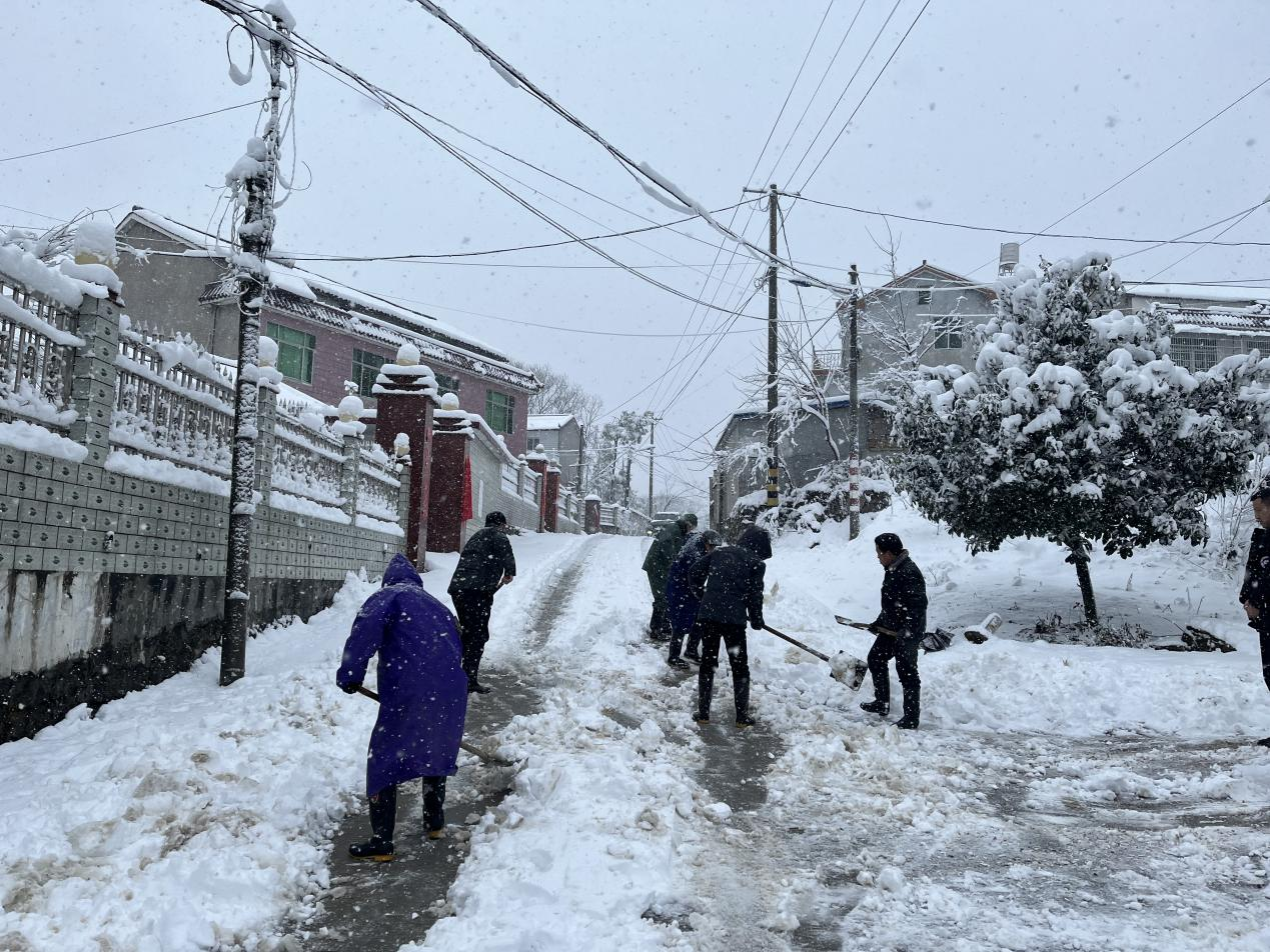 在楊墩自然村附近,老黨員楊賢祥正與退役軍人楊忠、群眾志愿者章謀友拿著鐵鍬,頂著颼颼襲來的寒風,冒著滿天飛卷的雪花,有條不紊地進行鏟雪除冰,雖然他們的臉和手早已被凍得通紅,但他們不畏嚴寒,依舊熱情高漲、干勁十足。隨后不久,附近幾位村民在他們的榜樣力量帶動下也紛紛加入到了鏟雪除冰的行列。