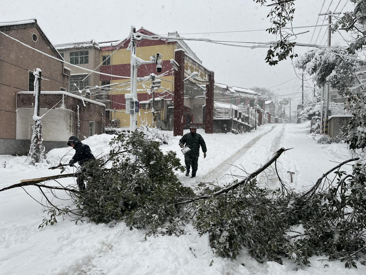 “喂,是雪年嗎?吳家老屋的自來水管道凍裂了,農戶家里停水,需要水電工搶修,請迅速安排處理。”期間,有村民打電話向村委會副主任楊雪年求助。事情緊急,楊雪年當即聯系水務公司人員去現場搶修,并馬不停蹄地趕到村民組將自來水閥關閉,來不及喘一口氣,她轉身又投入到了鏟雪除冰的行動中。