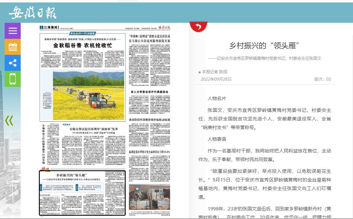 張國文,安慶市宜秀區羅嶺鎮黃梅村黨委書記、村委會主任,先后獲全國脫貧攻堅先進個人、安徽最美退役軍人、全省“皖美村支書”等榮譽稱號。