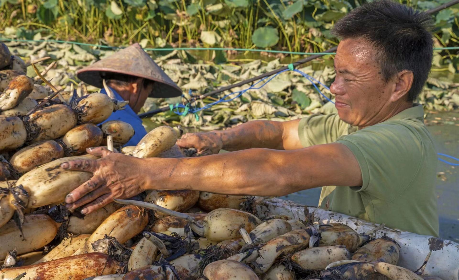蓮藕的豐收也為村民增收致富開辟了新路子,遠遠望去,數名挖藕工人正在藕塘里埋頭工作,奮力挖出這份藏在蓮塘里的香甜。