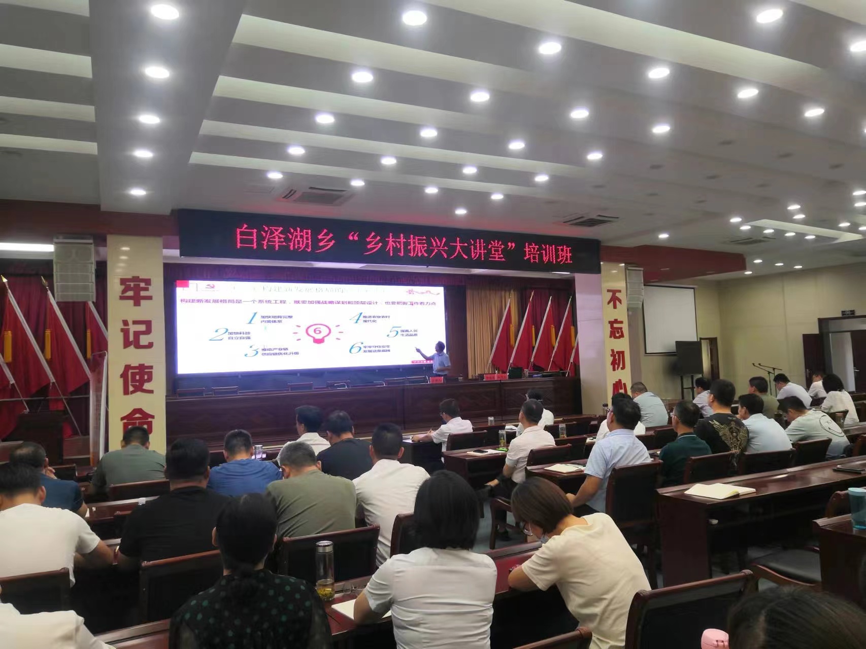 白澤湖鄉堅持以講促學、學以致用、推動工作,設立鄉村振興大講堂,以聚焦產業振興、人才振興、文化振興、生態振興、組織振興為重點任務,通過專家講座、會議交流研討、觀看電影等方式,為鄉村干部“補鈣”和“充電”,增強鄉村振興工作本領。