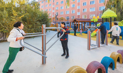 內蒙古自治區呼和浩特市玉泉區78個老舊小區完成升級改造,小區內的基礎設施、居住環境、房屋功能得到明顯提升。圖為玉泉區濱江花園小區居民在改造后的健身區鍛煉身體。