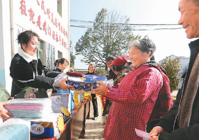 江西省撫州市東鄉區小璜鎮圍繞愛護環境、鄰里互助等內容創建文明積分制度,引導村民共建共享文明鄉村。圖為小璜鎮洋湖村村民用積分兌換物品。