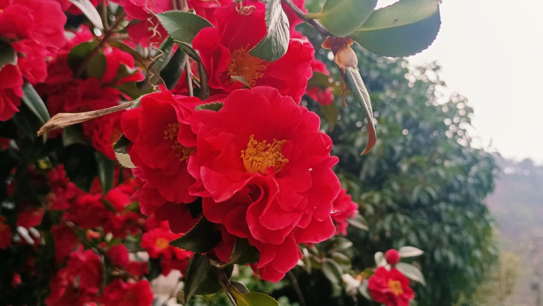 山茶花開,燦若紅火,從遠處看,鮮紅的山茶花像一顆顆紅寶石鑲嵌在墨綠之間,又像一團團燃燒著的火焰。走近一看,盛開的花瓣層層疊疊,像紅舞裙一般,中間露著嫩黃色長長的管狀花蕊,湊近一聞,一股淡淡的清香撲鼻而來,頓時讓人心曠神怡。