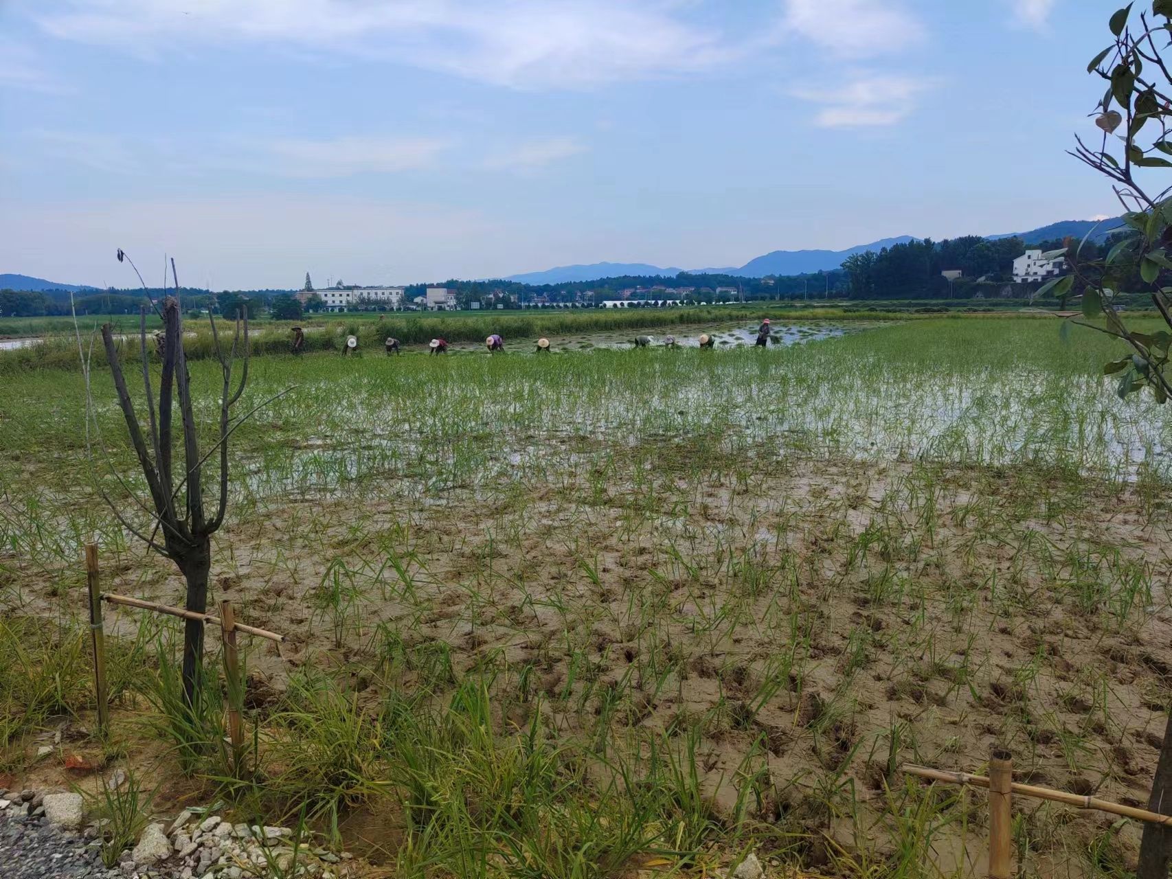 7月中旬,天空剛泛起魚肚白,五橫鄉曰公社區的“高標準農田”迎來了插秧期,顯云家庭農場的負責人查顯云搶抓晴好天氣,組織人手栽插秧苗,田間一派繁忙景象。不一會,一行行一排排秧苗矗立在田間,鱗次櫛比,隨風搖曳,仿佛為大地披上了綠色的紗衣。